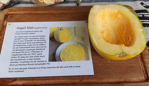 Aus dem Fruchtfleisch lassen sich leckere Gerichte zaubern.Sie wissen nicht, wie man die Streifen herstellt? Es gibt verschiedene Arten, dies ist eine: Schneiden Sie den Kürbis der Länge nach durch und entfernen Sie die Samenleiste. Legen Sie die Hälften mit der Schnittfläche nach unten auf ein mit Backpapier ausgelegtes Bachblech und lassen Sie sie ca. 35Minuten im vorgeheizten Ofen bei 200°C garen. Ziehen Sie dann mit einer Gabel durch das Fruchtfleisch, so dass Streifen entstehen. Verarbeiten Sie die Streifen in ihrem gewünschten Rezept und genießen Sie. Es ist eine sehr gute Alternative zu Pasta, man kann ihn aber auch kalt in einem Salat verarbeiten.